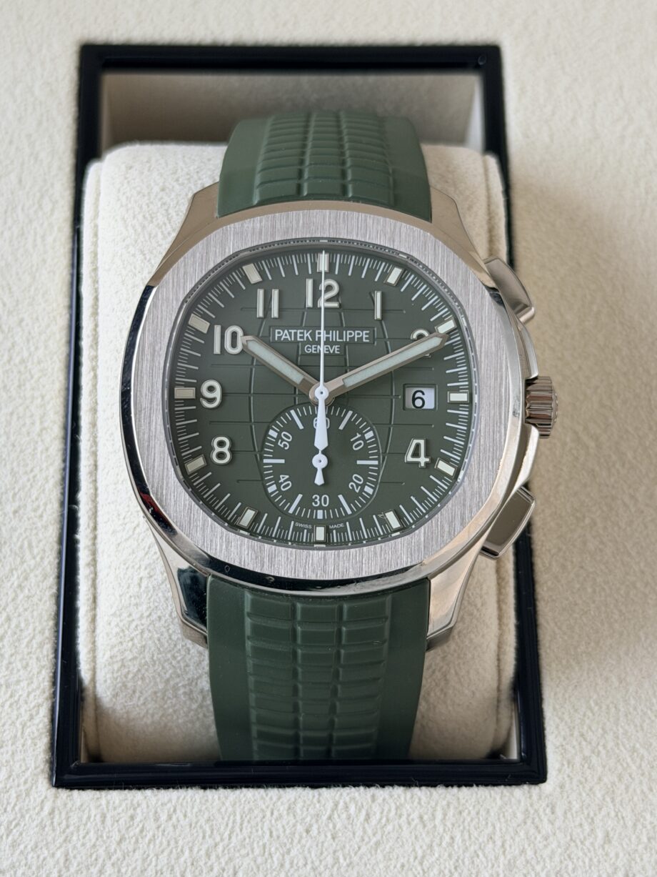 The Patek Philippe Aquanaut Chronograph 5968G-010 is a remarkable timepiece that perfectly marries sophistication with a sporty edge. Featuring a striking green dial, this watch is distinguished by its 42mm white gold case and a textured rubber strap that enhances its adventurous spirit. The chronograph functionality is beautifully integrated, showcasing sub-dials for timing functions while maintaining an elegant layout. Luminous markers and hands ensure clear visibility, even in low light, while the iconic Aquanaut design remains unmistakable. The 5968G-010 is not just a watch; it’s a symbol of refined taste and Patek Philippe’s unwavering commitment to exceptional craftsmanship.